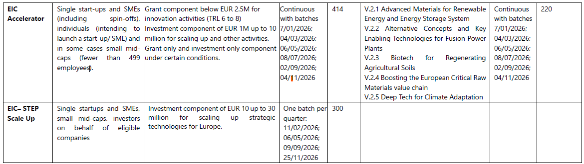 - EIC Accelerator – 634 milijuna eura za start-upove i MSP-ove koji razvijaju i šire inovacije s potencijalom stvaranja novih tržišta ili disruptivnih rješenja (bespovratna sredstva do 2,5 milijuna eura te ulaganja od 0,5 do 10 milijuna eura).